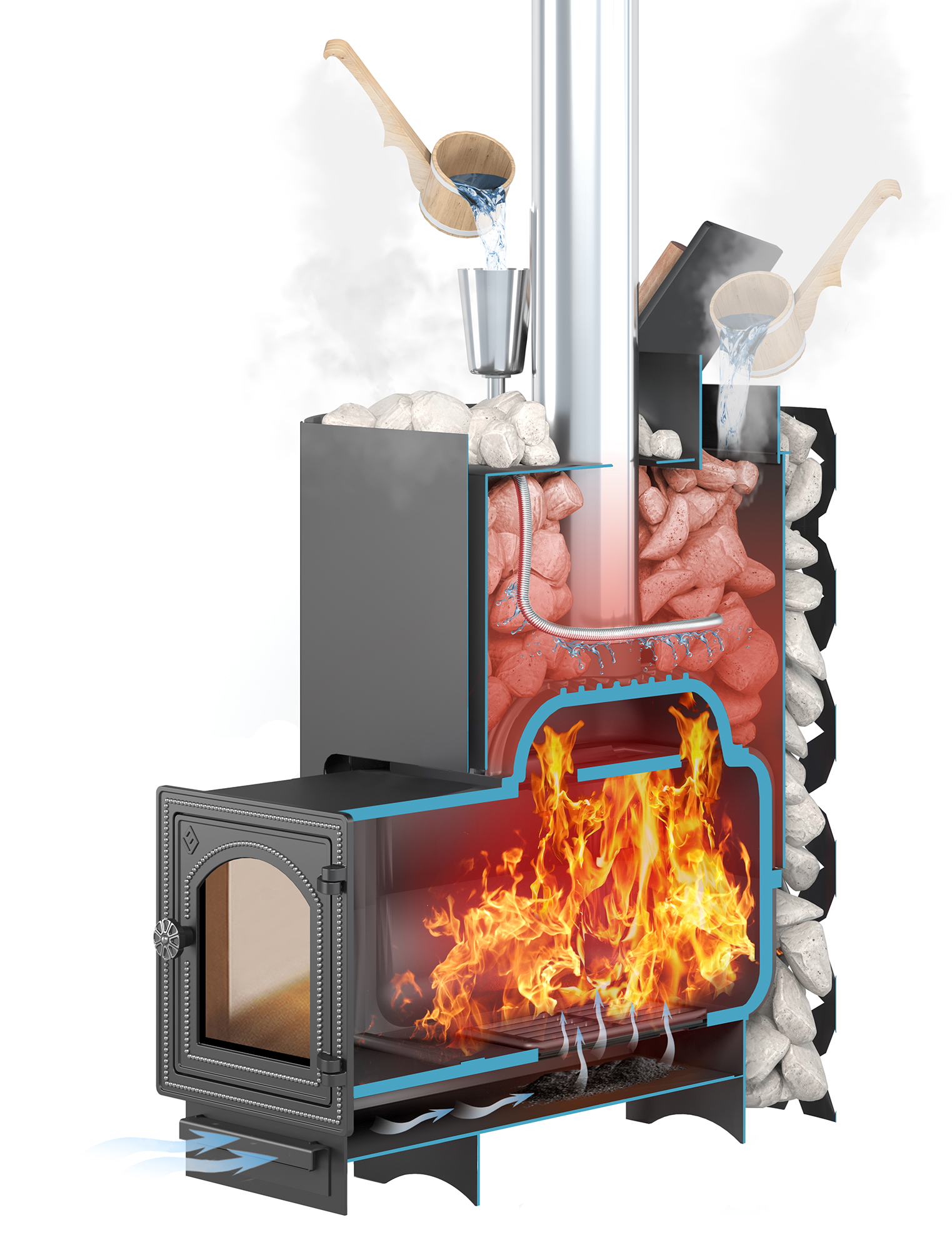 Чугунная банная печь ЭТНА 18 (ДТ-4) Закрытая каменка рассчитана на работу в парной объёмом до 18 м3. Цельно литая чугунная дверца сохраняет свою форму при нагревании. Крепление дверок к топочному тоннелю – болтовое, позволяет снимать и заменять дверку. Сетка для камней сделана в виде корзины из стального прутка диаметром 6 миллиметров. Три кольца из стальной полосы толщиной 2 миллиметра придают сетке дополнительную прочность и улучшают внешний вид. Сетка изготовлена из конструкционной стали. По всей высоте в сетку укладываются камни для бани. Заклад равномерно распределяет тепло в пространстве парной, а так же защищают парящихся от жёсткого инфракрасного излучения. Кожух диаметром 590 миллиметров вмещает в себя до 120 килограммов камней крупной и средней фракции.