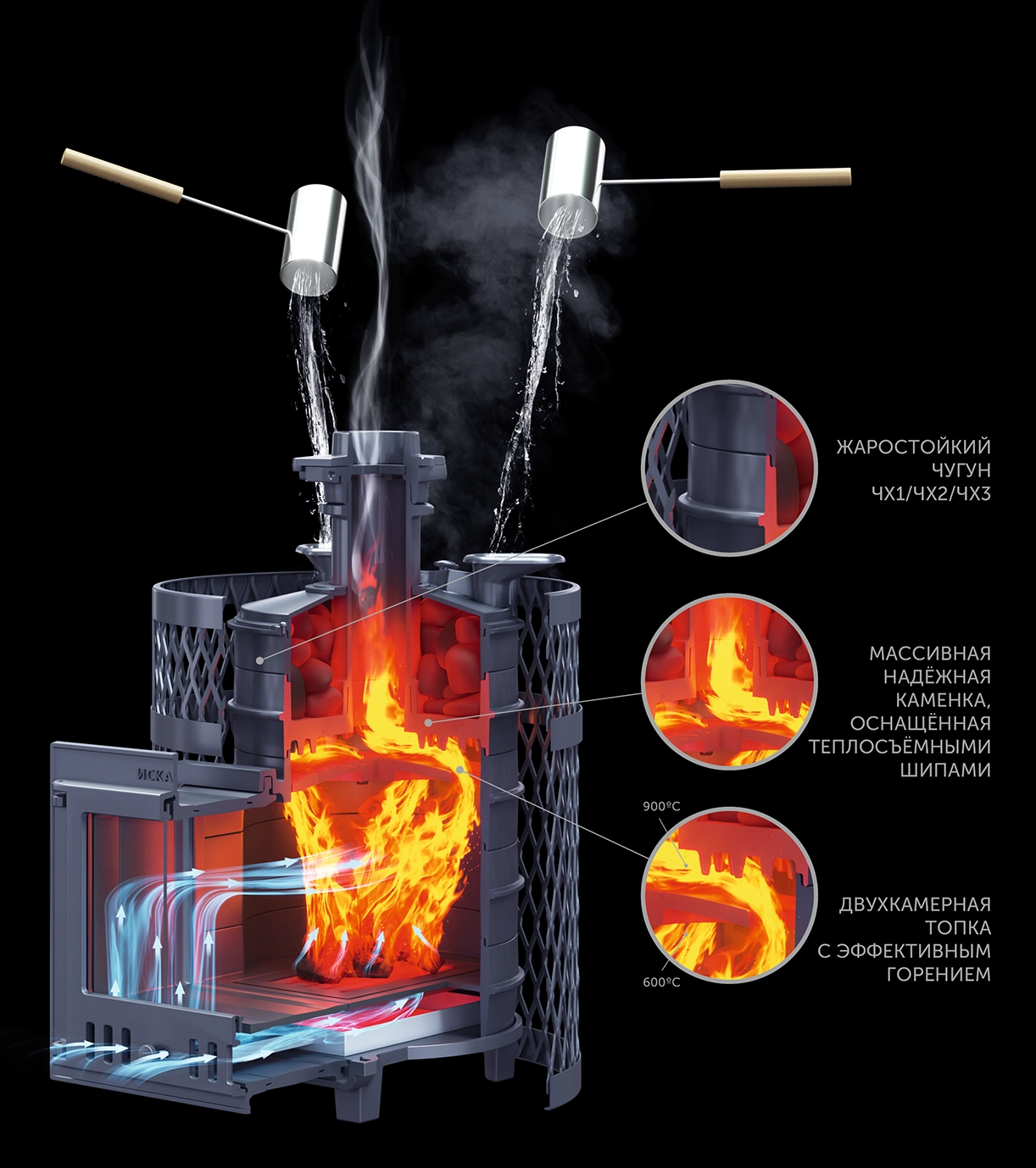 Чугунная банная печь с прямым нагревом парообразователя. Печь со стенками толщиной 14 миллиметров быстро нагревает воздух в парной и производит качественный мелкодисперсный пар за счёт теплоёмкой каменки, оснащённой теплосъёмными шипами на нижней поверхности.