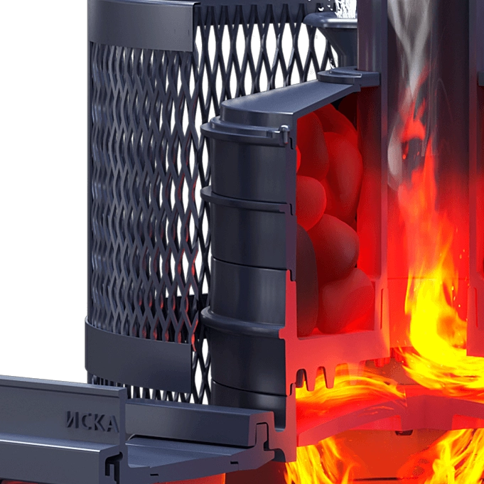 Печь Искандер получила от старших моделей парообразователь прямого нагрева - чугунную каменку имеющую существенную толщину и массу для аккумуляции тепла. Нагреваясь свыше 600С она эффективно нагревает дополнительный заряд, и при попадании воды даёт лёгкий мелкодисперсный пар. Расположенные снизу теплосъёмные шипы ускоряют нагрев парообразователя.