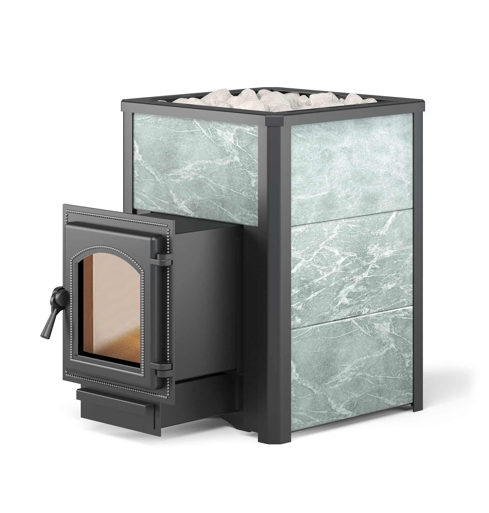 Печь Печь для бани Везувий Легенда 16 (270) Талькохлорит сочетает в себе привлекательный внешний вид и эффективную конвекционно аккумулирующую печь, способную за короткое время прогреть помещение и оставить его теплым в течение длительного времени. Облицовка печи выполнена из натурального природного камня талькохлорита. Данная горная порода способна долго удерживать тепло. Облицовка из натурального камня препятствует жесткому инфракрасному излучению, передаваемому стенками топки, поэтому тепло от поверхности печи получается мягкое и ровное. Конструкция печи Везувий рассчитана на установку в парильном помещении с выходом топки в смежное помещение. Панорамная дверка шириной стекла 190 мм позволит наблюдать за огнем из комнаты отдыха.