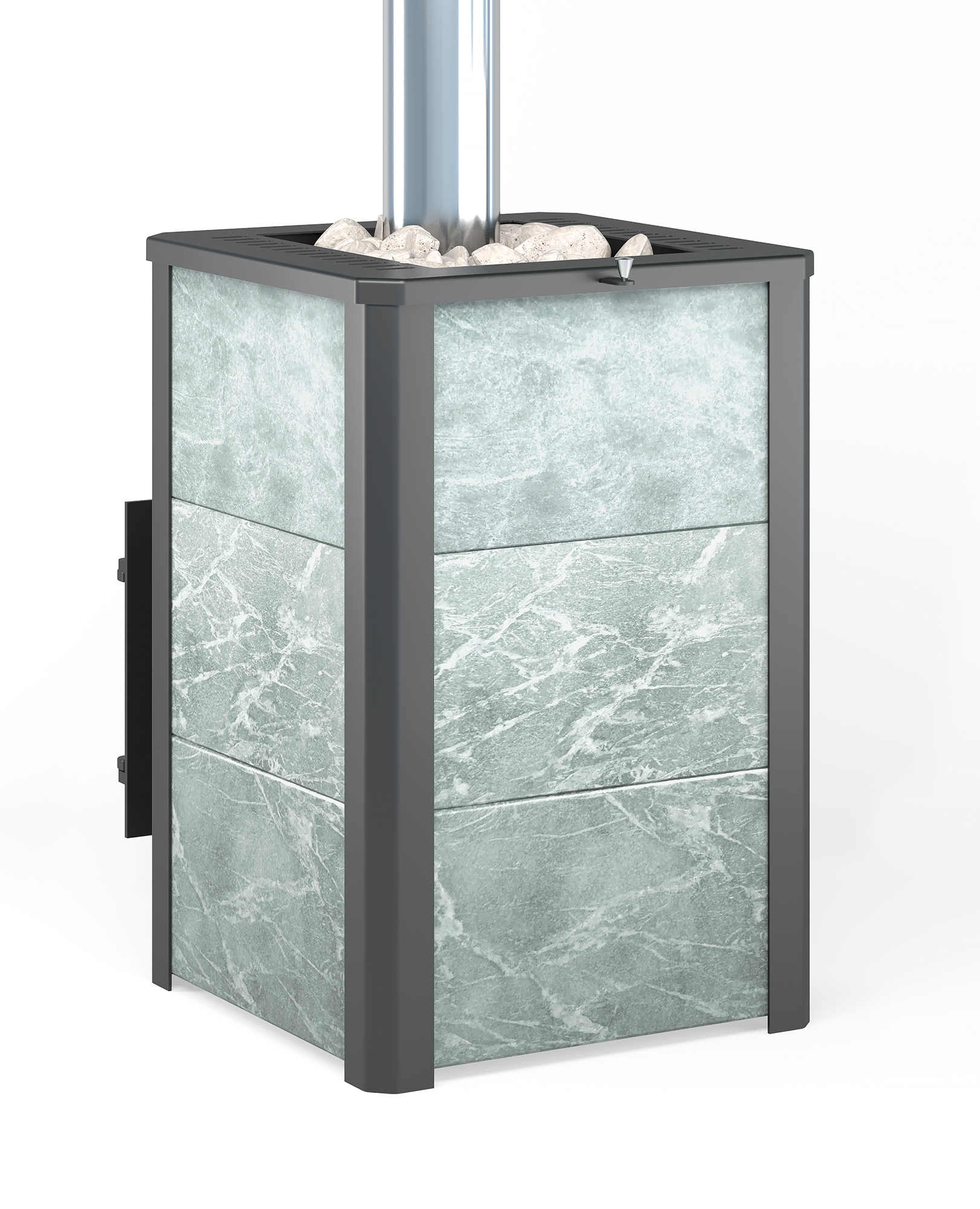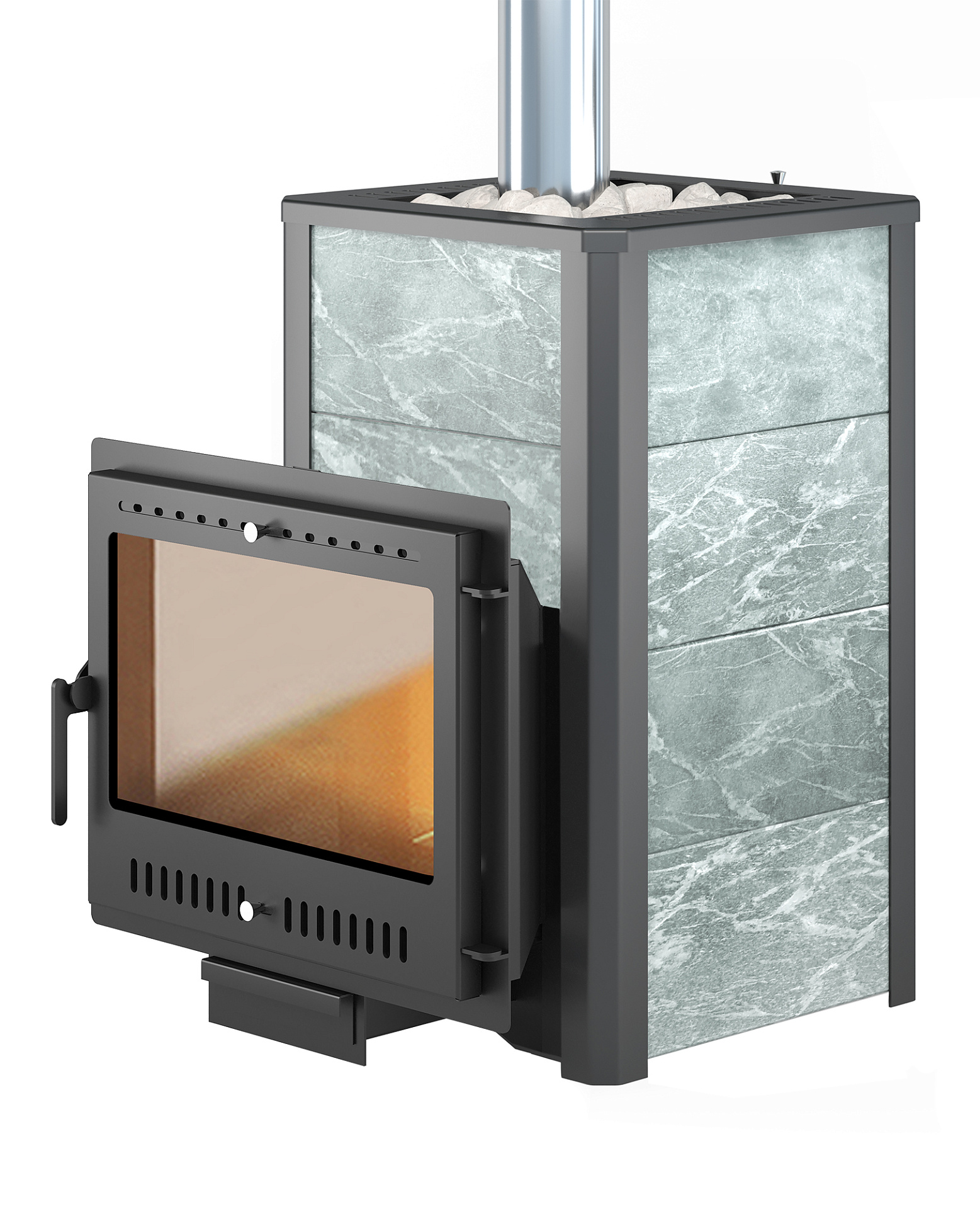 Конвекционно–вентилируемая облицовка, изготовленная из экологически чистой горной породы , который обладает большой теплоёмкостью, что позволяет камню в короткие сроки нагреваться и максимально долго удерживать стабильную температуру в парильном помещении, а также гасить жёсткое инфракрасное излучение Камень обладает исключительными лечебными свойствами: помогает при головных болях, при нестабильном артериальном давлении, при простудных заболеваниях, воспалительных процессах в почках и пищеварительной системе, снимает повышенную возбудимость и нервозность, сглаживает эмоциональные всплески. Облицовка из натурального камня при нагреве способна аккумулировать тепло, что гарантирует максимально равномерный прогрев и сохранение тепла Банная печь Легенда 28 Панорама "М" талькохлорит укомплектован чугунной каминной, самоохлаждаемой дверцей Везувий 505 с большим жаропрочным стеклом «SCHOTT ROBAX», с оборудованной системой самоочистки, что позволяет визуально контролировать горение и любоваться видом живого огня. Данная печь рассчитана на объем парильного помещения 14-30 м3.Дымоход и комплектующие