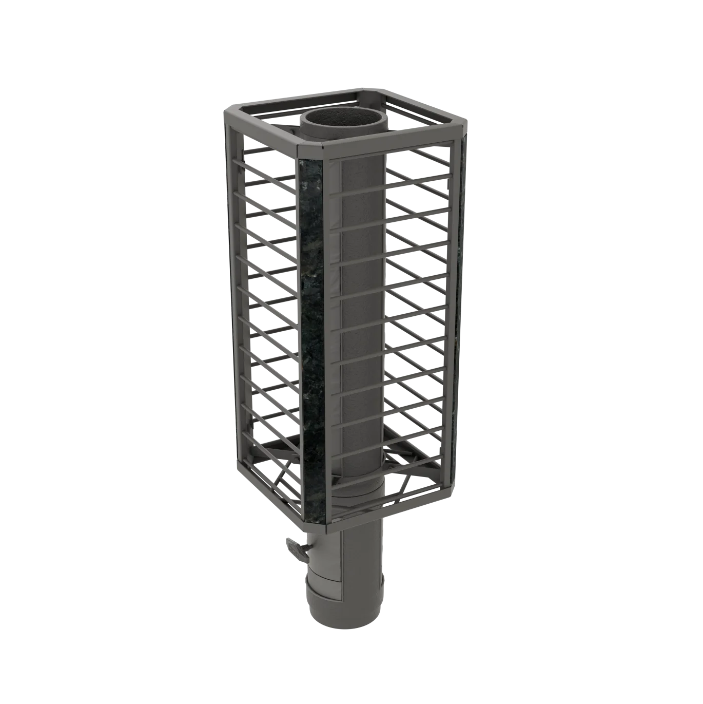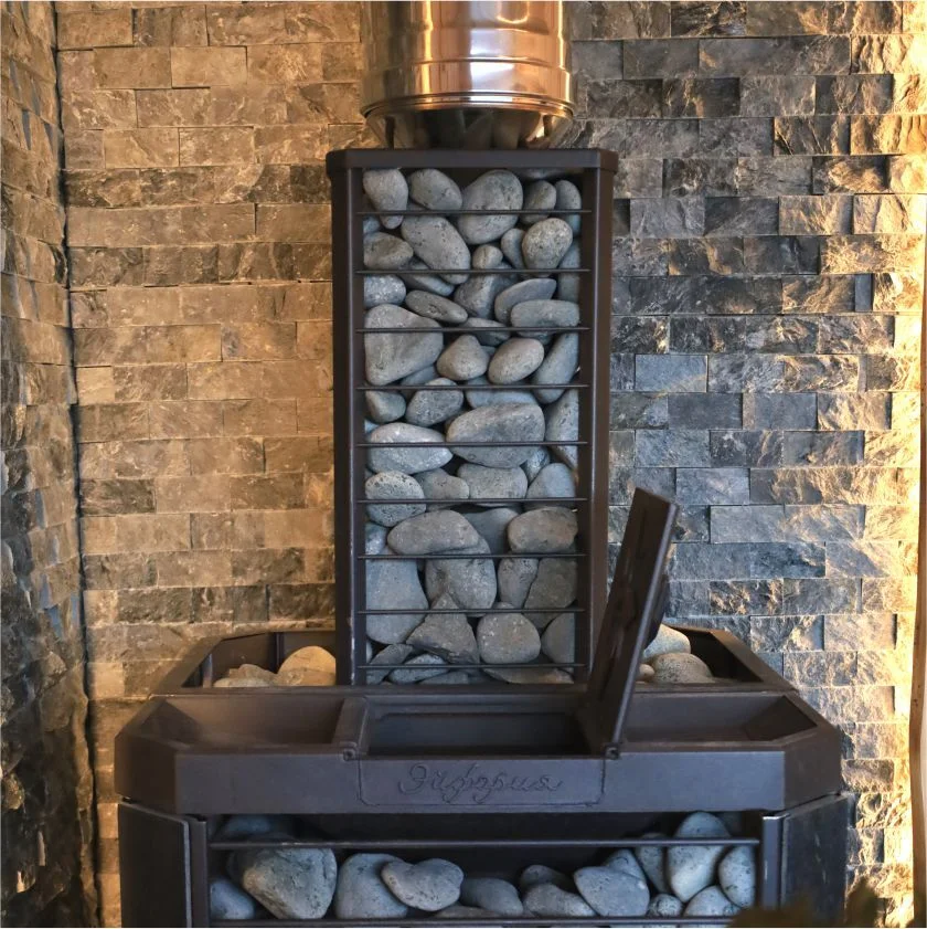 Сетка-каменка защищает от излучения, уменьшая поверхность открытой трубы, снимает тепло с ее стенок и направляет его на прогрев камней.