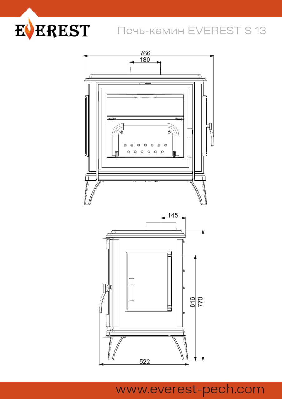 Новые линейка печей-каминов Эверест от производителя Везувий изготовлены из высококачественного чугуна. Они надежны, долговечны и доступные по цене. Печь Эверест отвечают стандартам пожарной безопасности, не выделяют в воздух токсичные вещества и не загрязняют окружающую среду. Печь-камин Эверест F13 имеет классический стиль, она подойдет и украсит любой интерьер. Печь отлита из жаропрочного чугуна высокого качества, не требует дополнительного фундамента для нее. Имеет удобную дверь для закладки дров, хороший обзор на пламя через стекло. Система «чистое стекло» предотвращает засаживание и копчение стекла при горении дров. Подача воздуха в топочную камеру осуществляется с помощью заслонки, что позволяет регулировать режим горения. Также имеется вторичный дожиг повышающий КПД печи, и минимизирует остатки продуктов горения. Через стеклянную дверку печи-камина серии ЭВЕРЕСТ (EVEREST) S13 приятно наблюдать за огнём, а глухая боковая дверь нужна для очистки топки и уходом за пламегасителем и дымоходом.