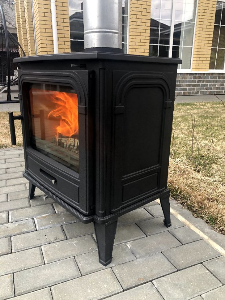 Три регулятора помогут установить необходимый режим работы печи и отапливать до 110 м2, а дымоход можно присоединить сверху или сзади.