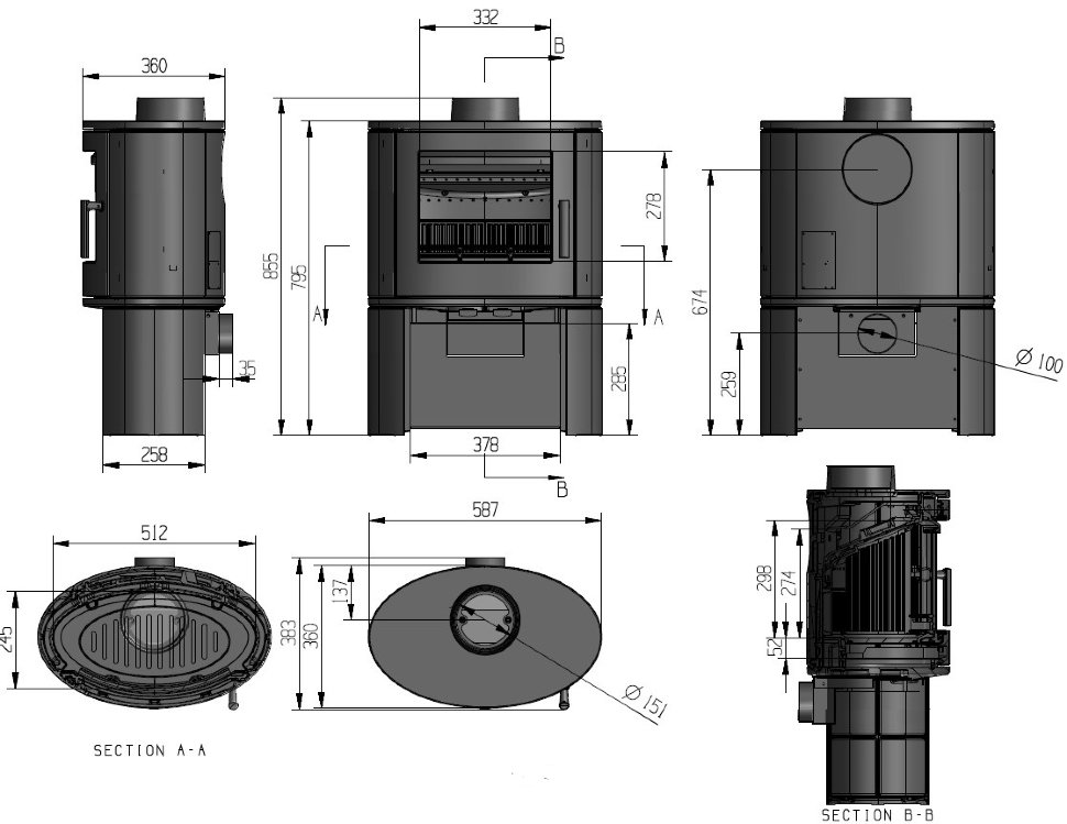 Для печи необходим дымоход диаметром 150 мм. Его можно подобрать в разделе дымоходы. Рекомендуем обратить внимание, что первыми элементами от печи могут быть дымоходы черного цвета из котловой стали,которые можно подобрать в разделе дымоходы КПД