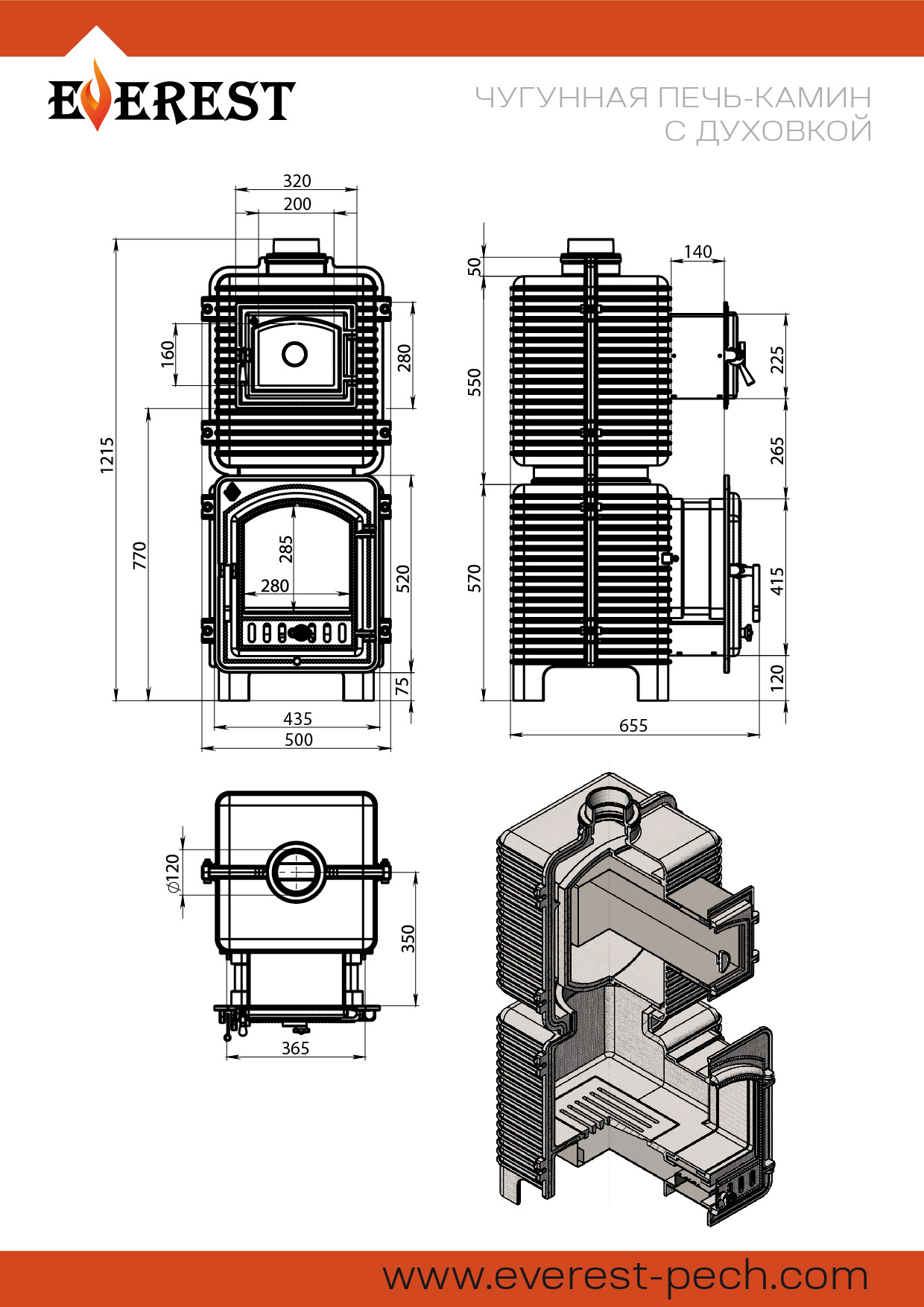 Печь-камин с духовкой ЭВЕРЕСТ (EVEREST) (под облицовку) изготовлен из качественного жаростойкого чугуна с толщиной стенок 8-20 мм.