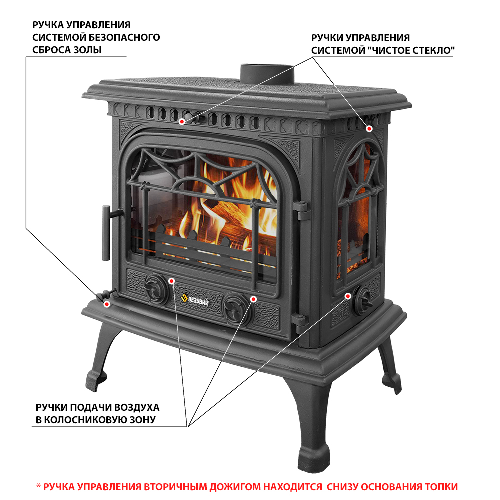 В нижней части дверцы расположены две ручки для регулировки подачи воздуха в колосниковую зону, которые помогают контролировать интенсивность горения.
