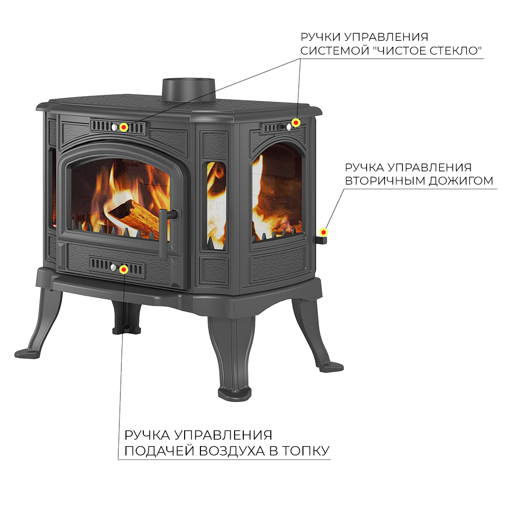 Чистота стекла во время работы обеспечивается системой подачи воздуха на внутреннюю сторону стекла. Воздух отсекает дымовые газы и пламя от поверхности стекла, предотвращая закопчение и потемнение стекла. На моделях KZ-14 , KZ-14S Ручка управления системой размещена в верхней части передней панели, над дверью у KZ-14Р с боку над стеклом.