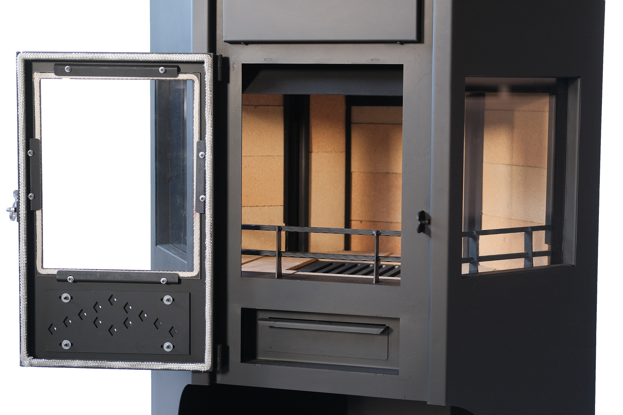 - Система ограждения для дров позволяет компактно размещать поленья внутри топки, защищая тем самым панорамное стекло от механических воздействий;