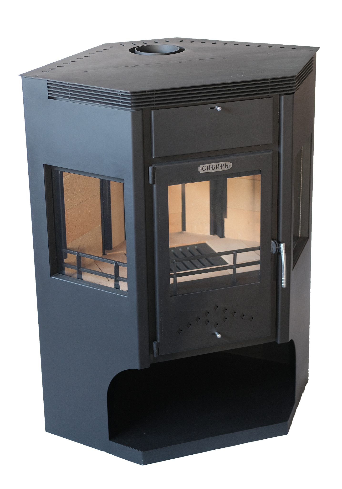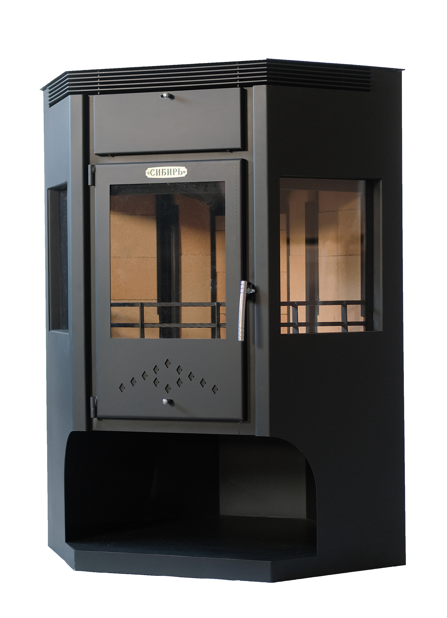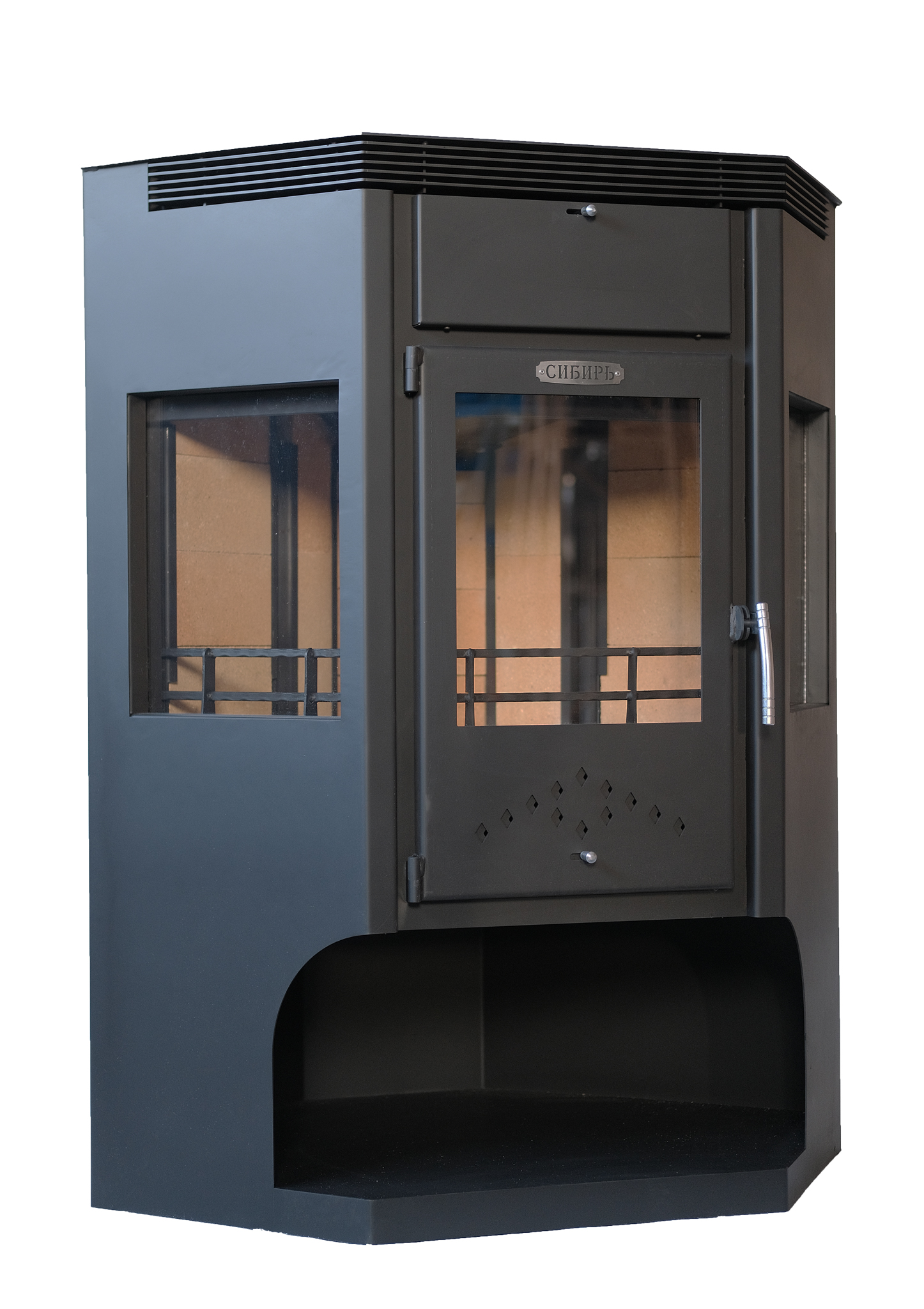 В конструкцию печи-камина "Сибирь" - 15 кВт внедрена доработанная система дожига вторичных газов, позволяющая увеличить КПД камина и скорость нагрева отапливаемого помещения.