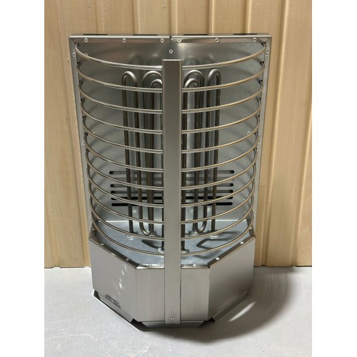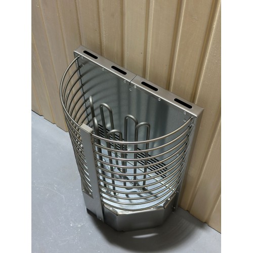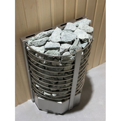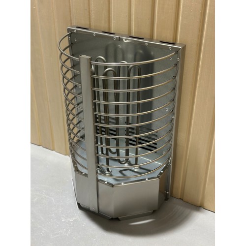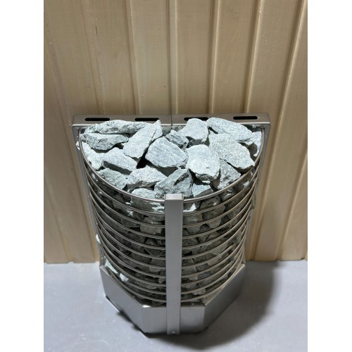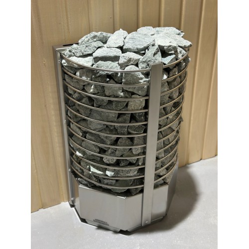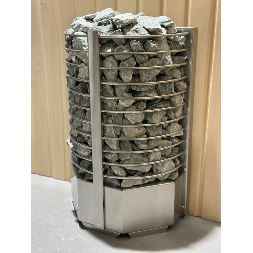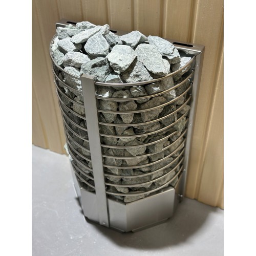 Электрокаменка выполнена из качественной нержавеющей стали и представляет собой полукруг с радиусными прутьями, вмещающий 60 кг камня.