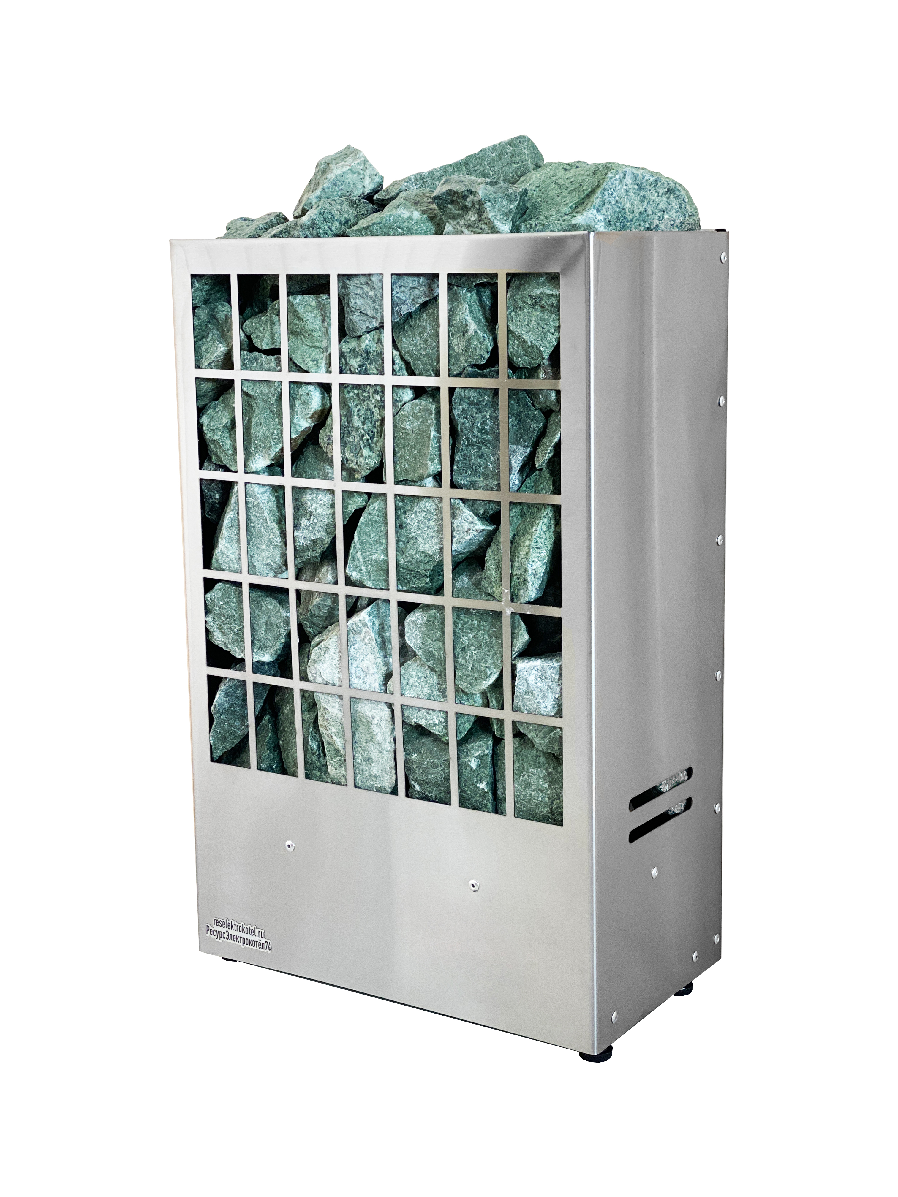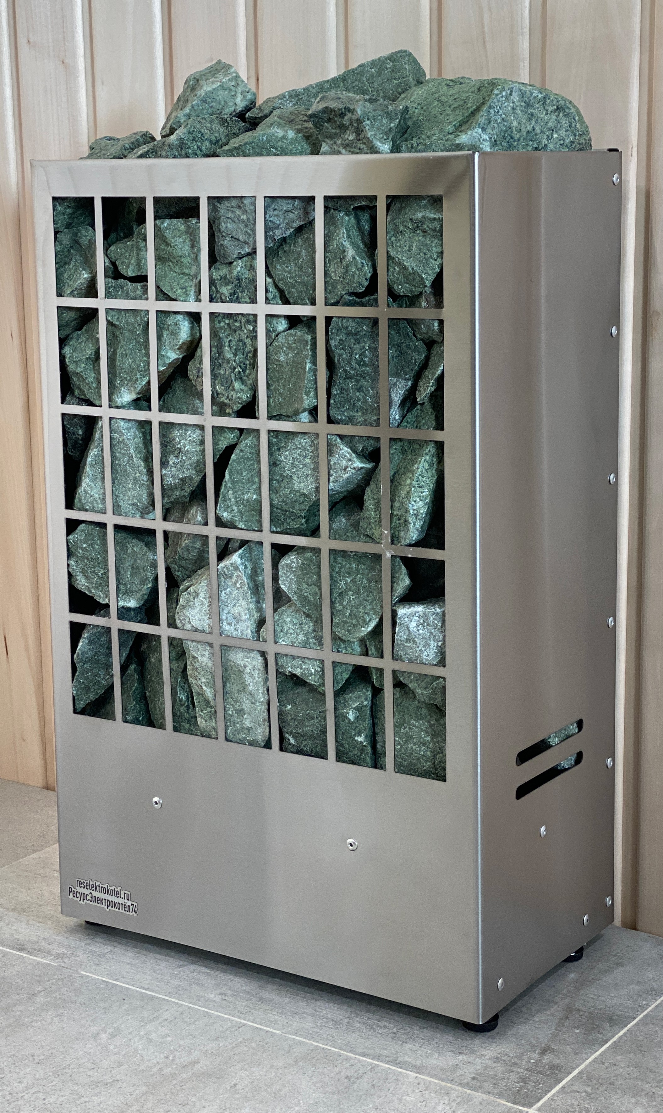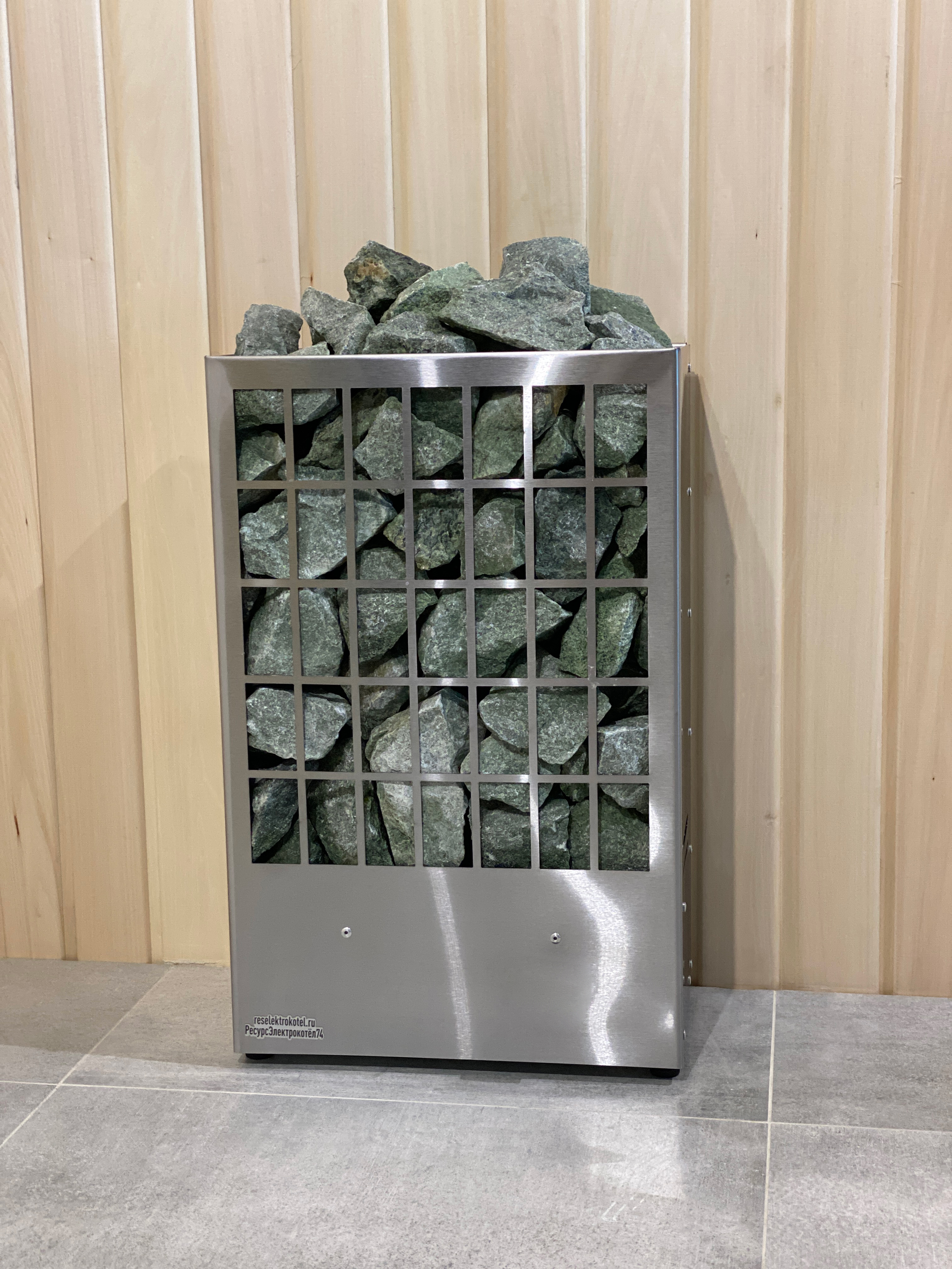 Корпус из нержавеющей стали. Листовой металл. Регулируемые опоры до 20 мм. Материал изготовления ТЭНов (нагревательных элементов) - нержавеющая сталь, средний срок работы тэнов - 10 000 часов, расположенных вертикально по всей камере, обкладываются вокруг камнем и сверху создается "горка" из камней.