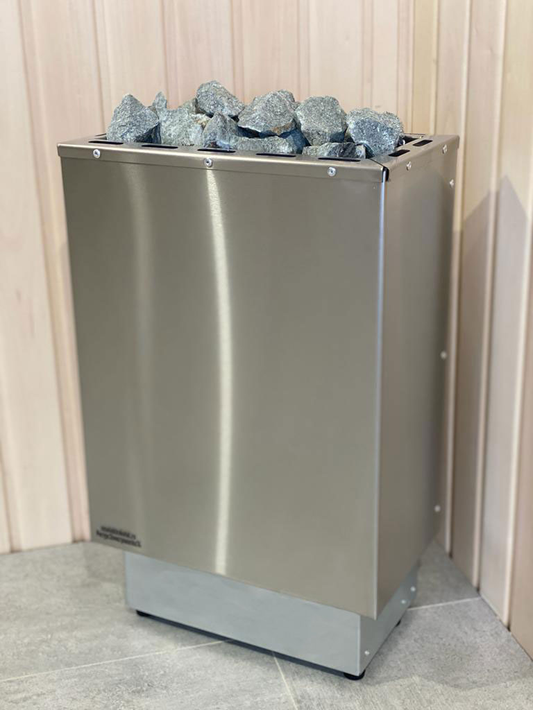 Корпус из нержавеющей стали. Листовой металл. Регулируемые опоры до 20 мм. Материал изготовления ТЭНов (нагревательных элементов) - нержавеющая сталь, средний срок работы тэнов - 10 000 часов, расположенных вертикально по всей камере, обкладываются вокруг камнем и сверху создается "горка" из камней.