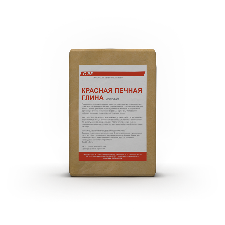 Красная печная глина производителя "СЭВ" применяется для приготовления кладочного раствора, используемого для строительства и ремонта бытовых печей и каминов с рабочей температурой до 850°.
