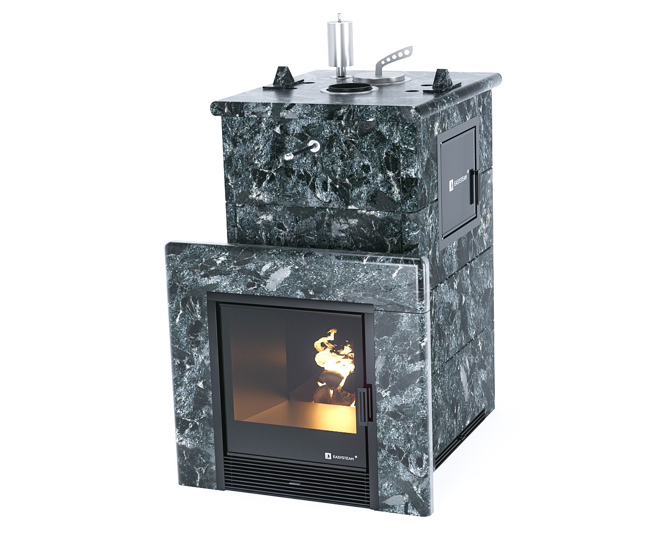 Печь для бани ИзиСтим Сочи М2 в полноценном кожухе предназначенная для использования в небольшой семейной бане с объемом парной не более 16 м3. Закрытая каменка и встроенный парогенератор гарантирует большое количество легкого пара. Печь Сочи М2 имеет боковой вход в каменку который позволяет провести более быструю ревизию камней и подачу воду прямо на камни, не используя парогенератор. На печи есть терморегулирующая задвижка, которая позволяет максимально рационально использовать тепловую энергию печи в двух режимах: интенсивный прогрев парной и каменки, или интенсивный прогрев каменки. Кожух из природного камня, создаст приятную атмосферу в парной, излучая мягкое тепло. Панорамная дверка размером стекла 370*370 мм позволит наблюдать за огнем из комнаты отдыха.