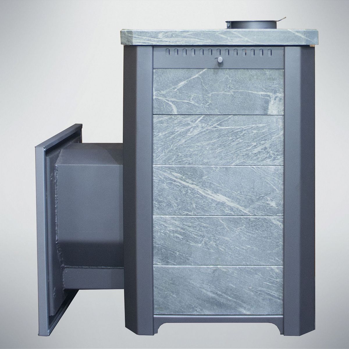 Печь Варвара Сказка сочетает в себе привлекательный внешний вид и эффективную конвекционно аккумулирующую печь, способную за короткое время прогреть помещение и оставить его теплым в течение длительного времени. Облицовка печи выполнена из натурального природного камня талькохлорита. Данная горная порода способна долго удерживать тепло. Облицовка из натурального камня препятствует жесткому инфракрасному излучению, передаваемому стенками топки, поэтому тепло от поверхности печи получается мягкое и ровное. Облицовка может быть выполнена в трех вариантах: Талькохлорит, Пироксенит, Змеевик. Панорамная дверка со стеклом шириной 255 мм в данной модели печи позволит наблюдать за огнем из комнаты отдыха.