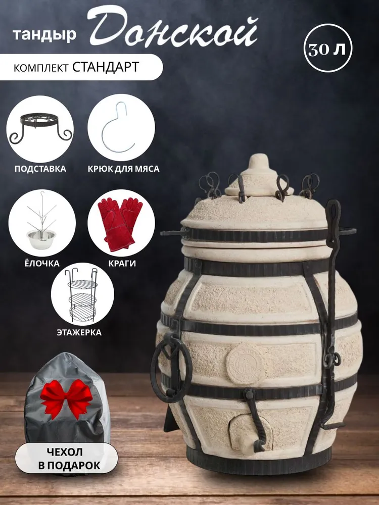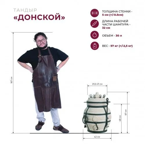 Тандыр сделан из глины и имеет толстые 5-сантиметровые стенки, диаметр горловины составляет 21 см, общий диаметр 42см, высота без крышки - 48 см. Все тандыры можно переносить, благодаря удобным боковым ручкам. Не смотря на компактность тандыр Донской обладает такой же функциональностью, как и более габаритные модели.