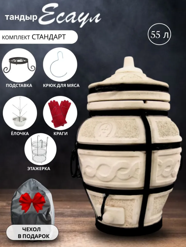 Тандыр сделан из глины и имеет толстые 5-сантиметровые стенки, диаметр горловины составляет 29 см, общий диаметр 54 см, высота без крышки - 61 см. Все тандыры можно переносить, благодаря удобным боковым ручкам. Несмотря на компактность тандыр Есаул обладает такой же функциональностью, как и более габаритные модели.