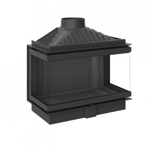 Топка выполнена из чугуна. Главная особенность этой модели - это П-образное трёхстороннее стекло без видимых рамок.Дверка топки открывается по бокам и с правой и с левой стороны, а фасадное секло остается зафиксированным. Ширина стекла составляет 645мм