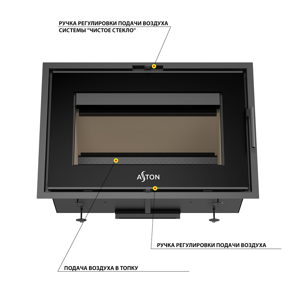 Второй канал подачи воздух проходит под верхней крышкой топочной камеры и заканчивается над дверью, где поступает в систему «чистое стекло». Воздух из этого канала распределяется по всей площади стекла сверху, препятствуя образованию копоти на двери топки. Рычаг-регулятор подачи воздуха расположен над дверью и имеет указатель увеличения или уменьшения подачи.