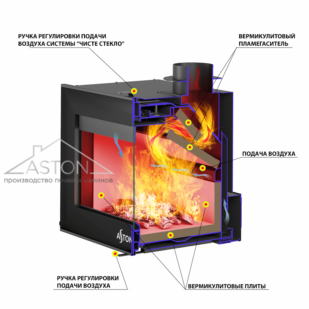 Вермикулит – материал, способствующий сохранению геометрии топки и защищающий сталь от перегрева. Вермикулитовые стенки и дно топки обеспечивают равномерное распределение высоких температур внутри топки в процессе горения, в том числе предотвращая засаживание стекла.