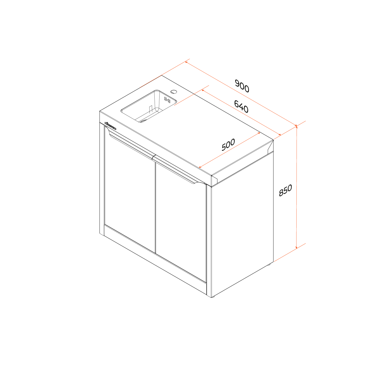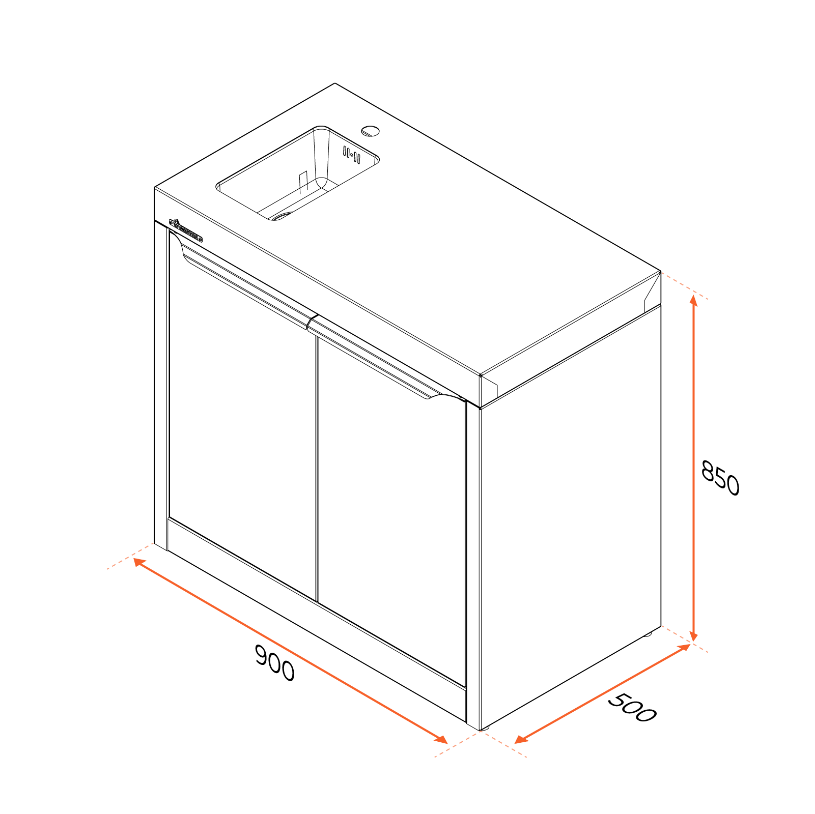 Тумба с мойкой имеет длину 90 см, и ширину 50 см.