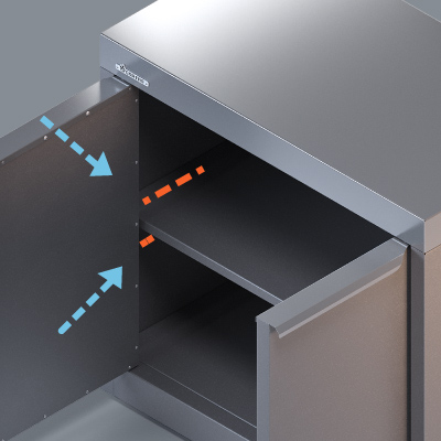 Столешница находится на высоте 87 см. от пола и изготовлена из нержавеющей стали, что гарантирует долгий срок службы при любой погоде.