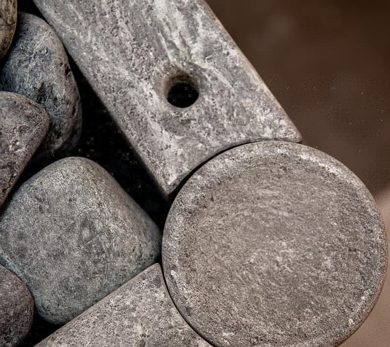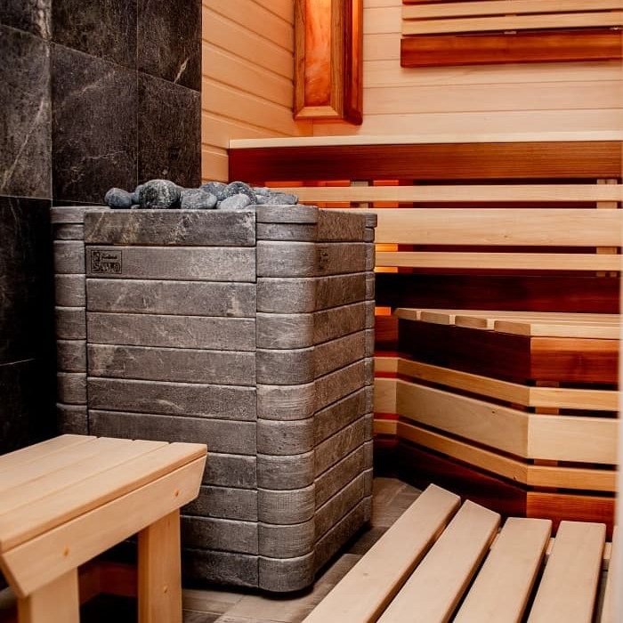 - Электрическая печь от производителя Sawo Nimbus 9 кВт в облицовке Талькохлорит с выносным пультом , в каменке использовался камень «Пироксенит Черный принц».